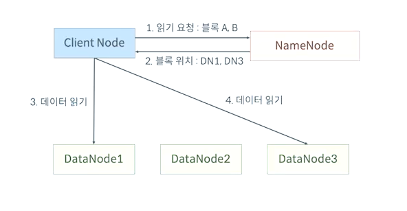 클라이언트에서 파일이 보관된 위치를 클라이언트에 반환을 하고 클라이언트는 DataNode들에게 데이터를 요구하고 읽게 됩니다.