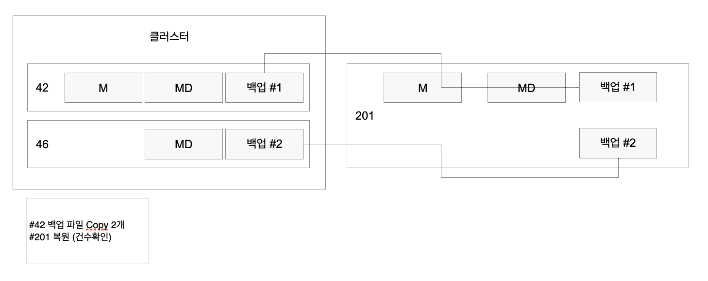 2개의 서버에 각각 마스터가 할당이 되어있기때문에 한개의 서버에서 백업을 실행하고 복원서버에 넣는경우