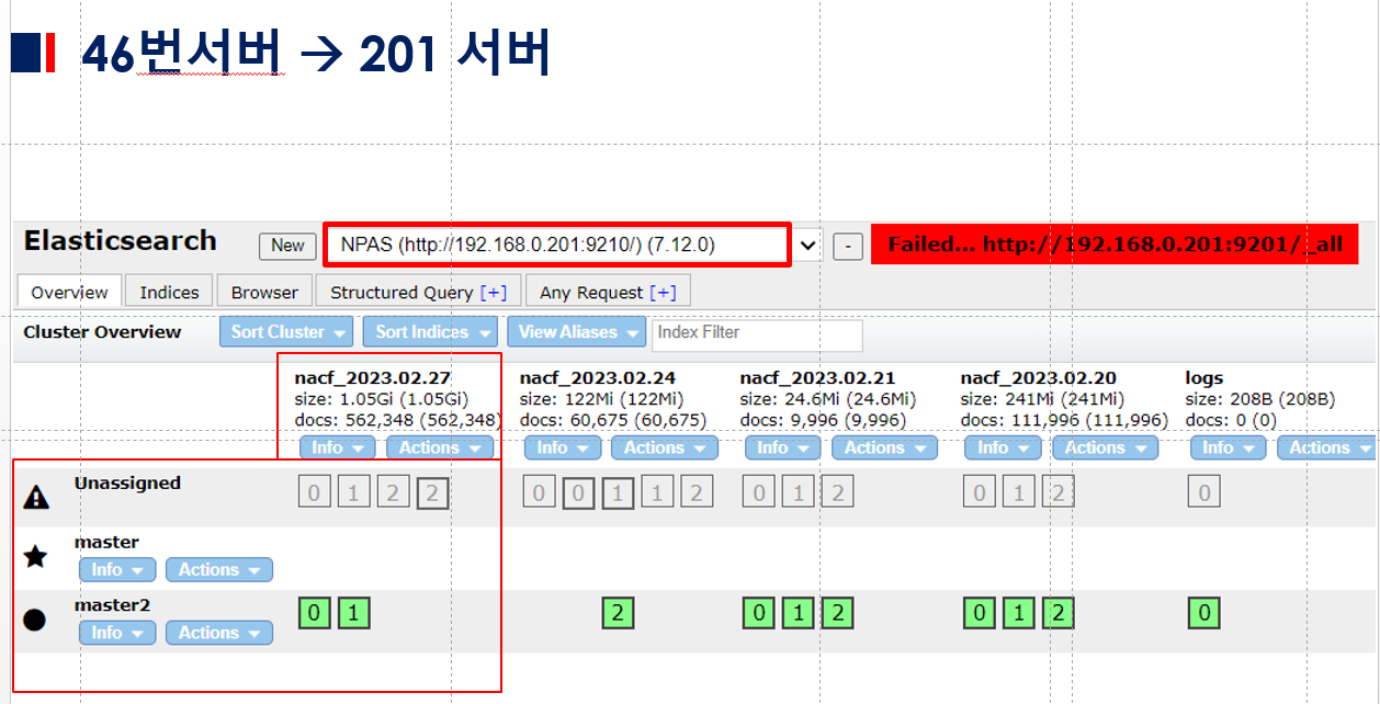 복구를 할때의 문제점이 있습니다. 201서버에서 현재 존재하는 인덱스의 명의 이름과 43서버에서 복구할때 가지고 있던 인덱스의 이름이 같다면 충돌로 복구가 되지 않습니다 이러한 상황일때는 재인덱싱을 통해서 인덱스의 이름을 변경후에 다시 진행해줘야합니다.