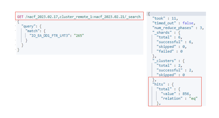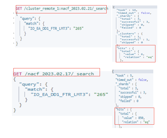 검색의 조건 : remote 의 클러스터를 검색할때는 클러스터 이름을 붙이고 인덱스 명을 붙여줘야합니다.