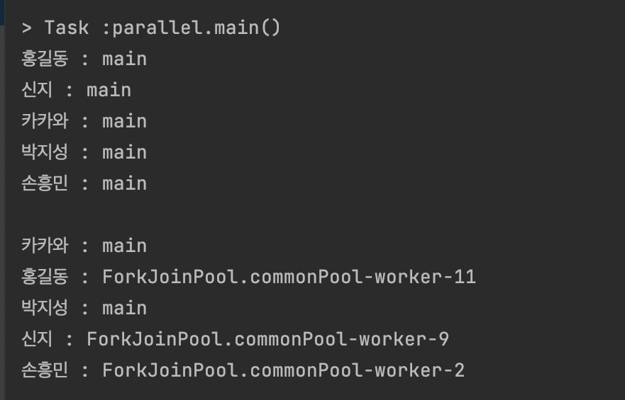 다음 예제를 보시면 순차 처리 스트림과 병렬 처리 스트림을 이용하여 사용된 스레드의 이름이 무엇인지 콘솔에 출력하여 보여드리겠습니다.