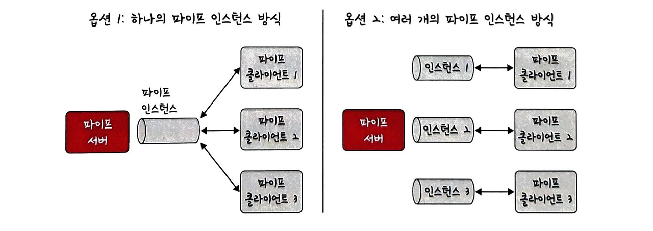 다음 그림처럼 보통 서버용 파이프와 클라이언트용 파이프로 구분해서 작동하며 하나의 인스턴스를 열거나 여러 개의 인스턴스를 기반으로 통신합니다.