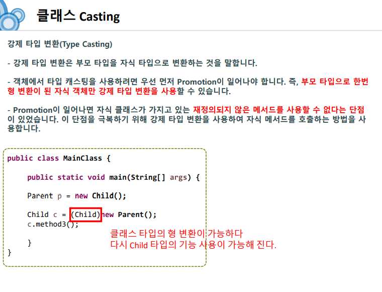 이때 부모클래스에 있는 기능만 사용할 수 있지만,