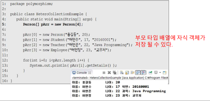 이종모음은 배열에 다형성을 적용시키는 원리입니다. 배열은 원래 동종모음 구조입니다.