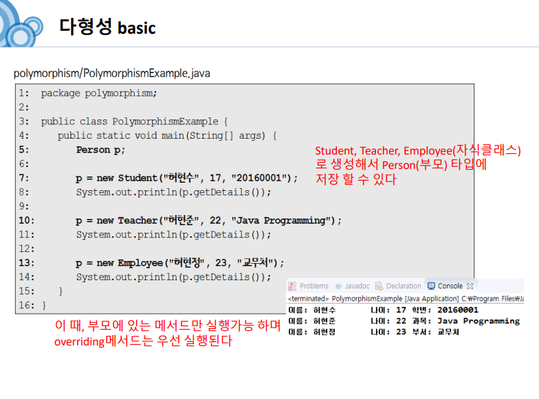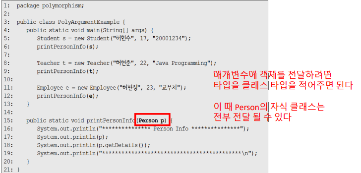 -보통 메서드를 호출할 때는 메서드 선언부에서 지정한 데이터 타입과 일치하는 매개값을 전달하여 호출하지만, 매개 변수에 다형성을 적용하면 자식 객체를 전달할 수도 있습니다.