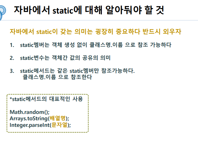 - 정적 변수는 객체를 만들어 참조할 수도 있지만, 객체를 만들지 않고 클래스 이름만 으로도 참조가 가능하기 때문에 이를 "클래스 변수"라고도 부릅니다