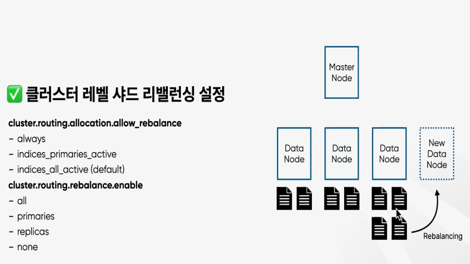 Cluster.routing.rebalance.enable – 재분배가 가능한 샤드의 종류 (all, primaries, replicas, none) Cluster.routing.allocation.allow_rebalance – 샤드 재분배를 허용하는 경우,
