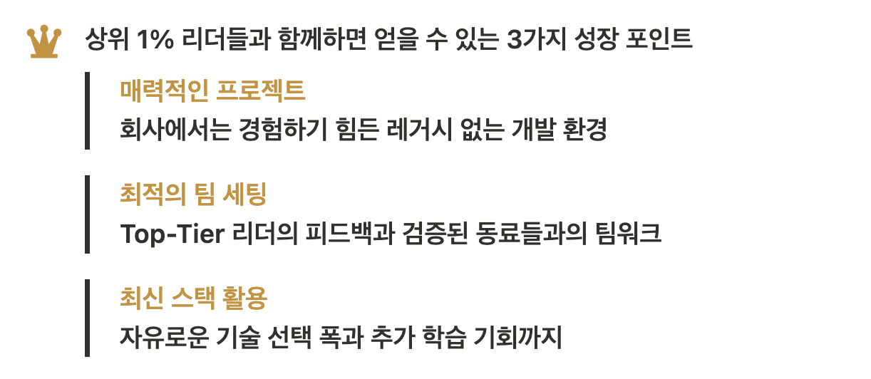Top-Tier 리더의 피드백을 바탕으로 실력있는 동료들과 팀 프로젝트를 진행하며 한 단계 더 도약할 수 있는 100% 프로젝트 중심의 재직자 대상 커리어 성장 코스입니다.