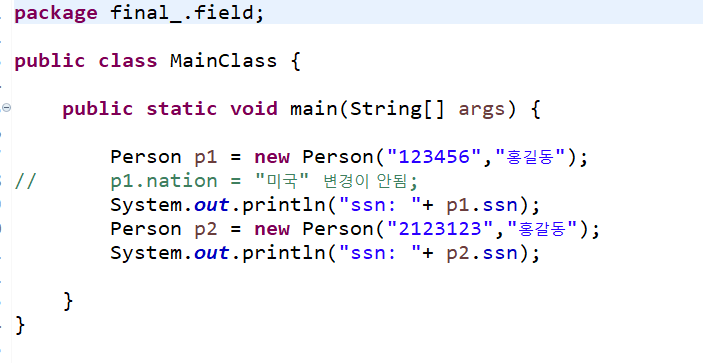 이 문제에서 Person에서 nation은 이미 값을 선언하여서 변경이 불가능합니다, 다만 ssn과 name은 초기화 하지 않아 값을 따로 지정이 가능합니다.