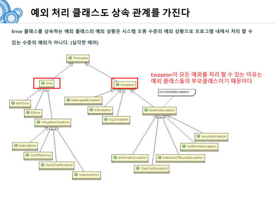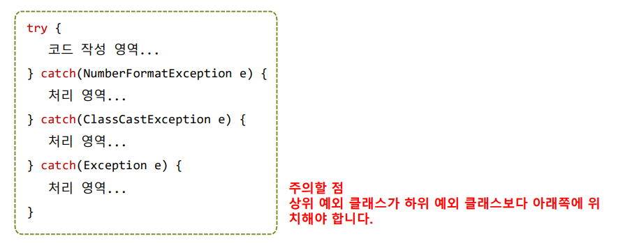 -catch블록은 위에서부터 차례대로 검색되므로 상위 예외 클래스의 catch블록이 위에 있다면 하위 예외 클래스이 catch블록은 실행되지 않습니다.