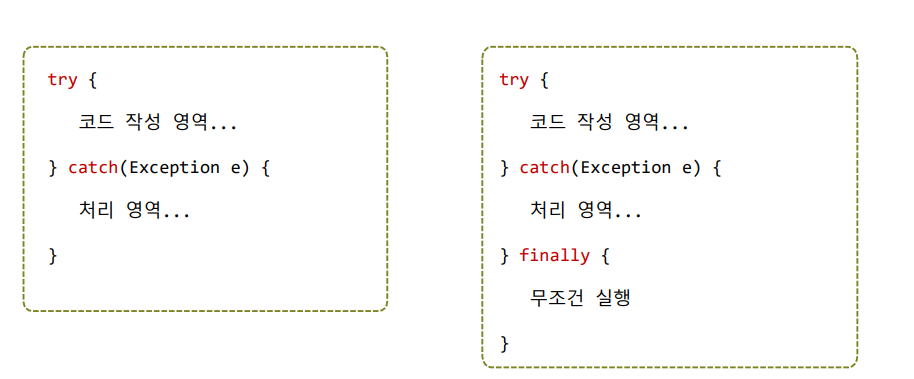 예외 처리 코드는 try-catch-fially 블록을 이용한다.