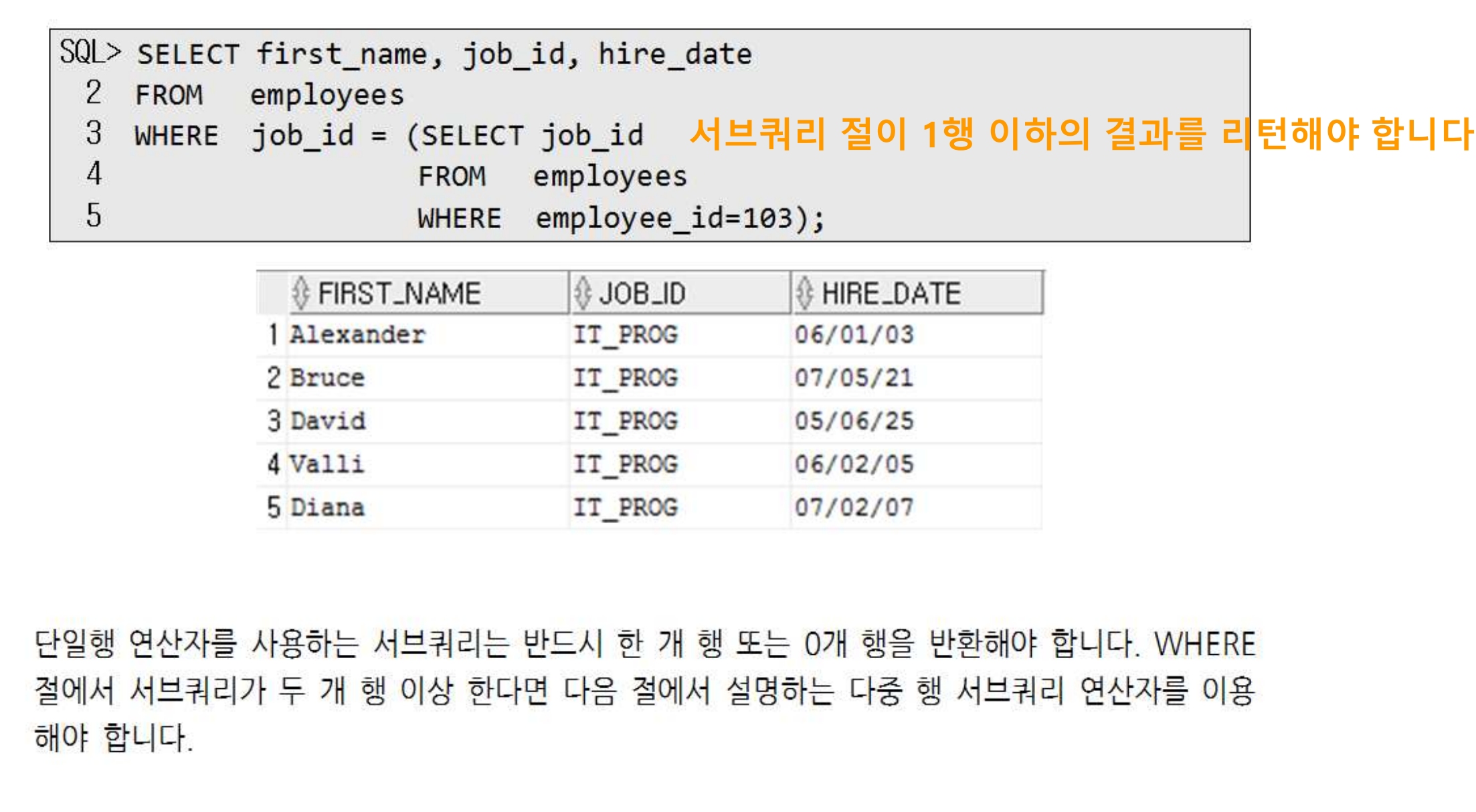 서브쿼리에서는 두 종류의 비교연산자를 사용합니다. 단일 행 서브쿼리에는 단일 행 연산자를 사용해야 하며, 다중 행 서브쿼리에는 다중 행 연산자를 사용해야 합니다.