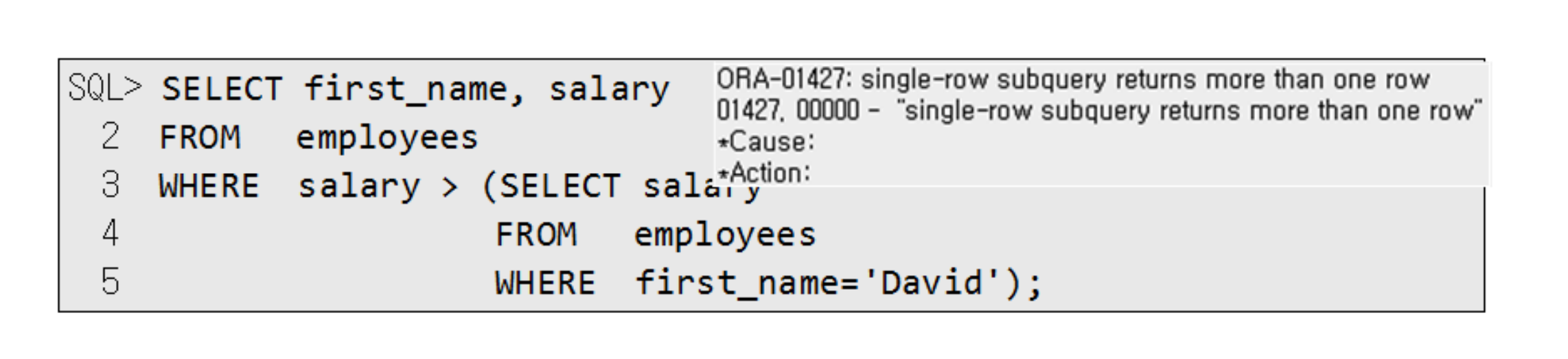 First_name = David 가 여러행이 존재하기 때문에 단일행 서브쿼리가 실행되지 않는다.