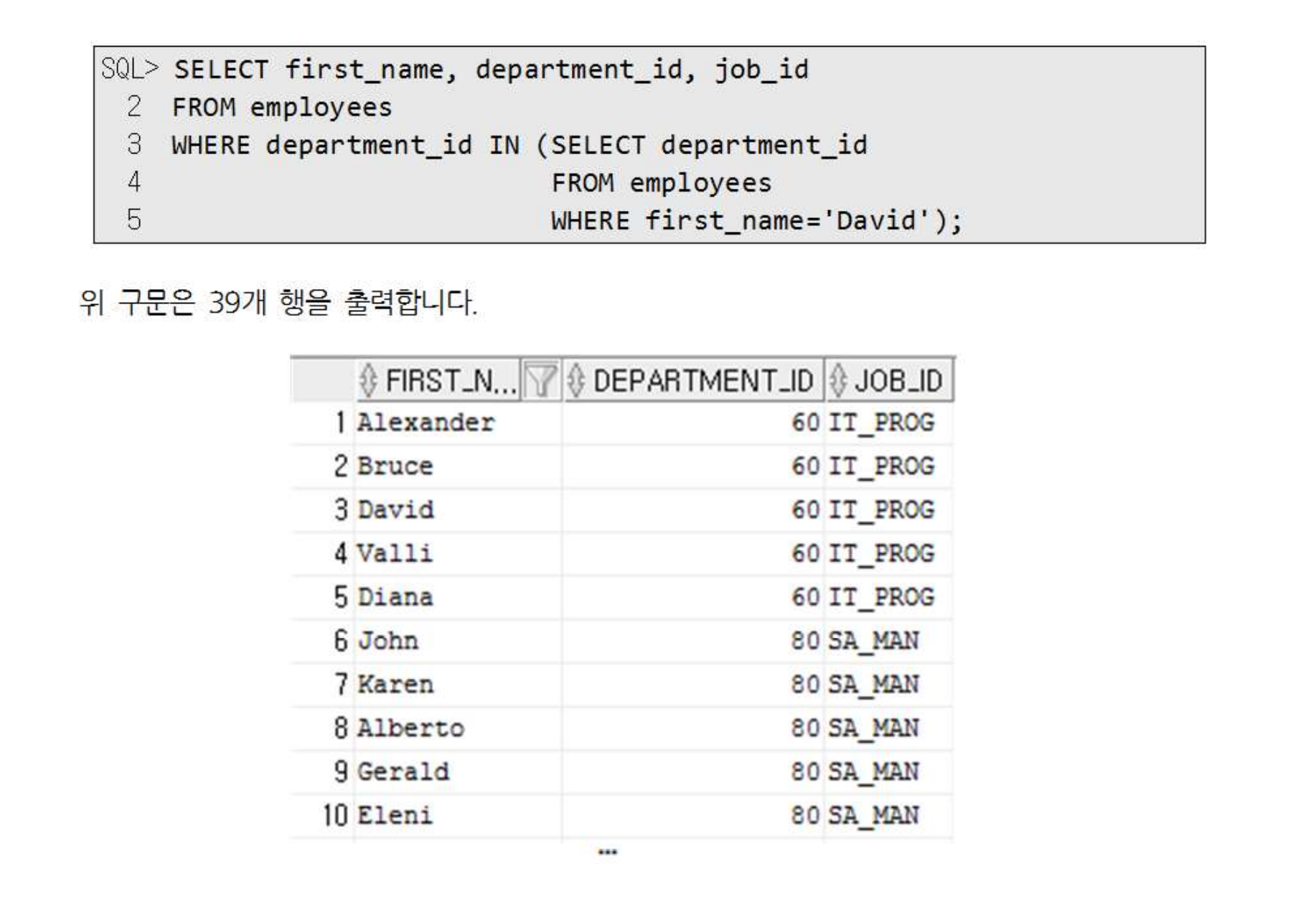 다음 구문은 David와 같은 부서에 근무하는 사원의 이름(First_name)과 부서번호, 직무를 출력합니다. IN 연산자와 서브쿼리를 이용하였습니다.