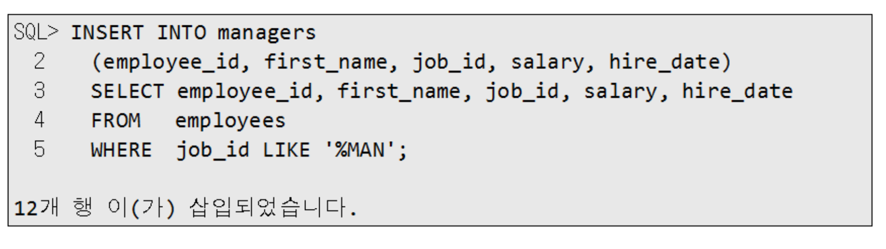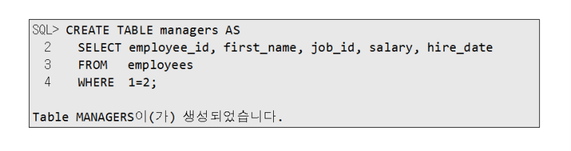 다음 구문은 EMPLOYEES 테이블로부터 SELECT 구문으로 조회한 결과를 MANAGERS 테이블에 저장합니다.