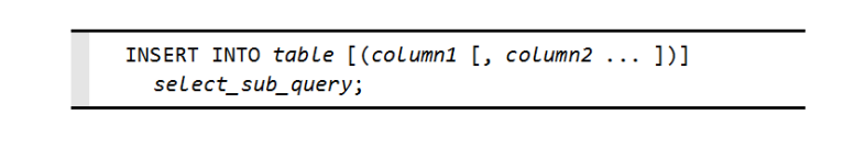 -SELECT_SUB-QUEARY : 행을 리턴할 서브쿼리입니다. INSERT절의 열 목록에서 열의 개수와 데이터타입은 서브쿼리에 있는 값의 개수와 그들의 데이터타입과 일치해야합니다.