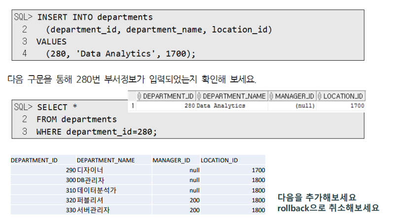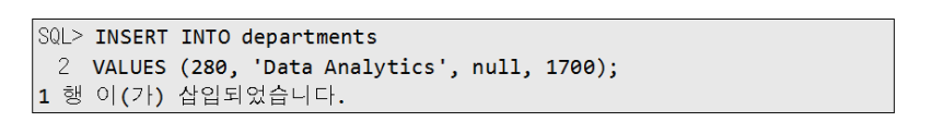 다음 구문은 DEPARTMENTS 테이블에 새로운 행을 추가합니다. 새로 추가되는 부서의 아이디는 280, 부서이름은 Data Analytics, 매니저 아이디는 null, 지역 아이디는 1700(미국 시카고)입니다.