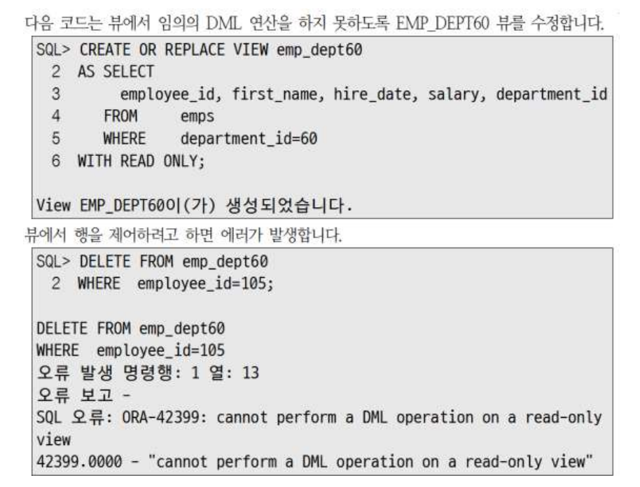 WITH READ ONLY 옵션으로 뷰를 생성하여 뷰에서 DML 연산이 수행될 수 없게 합니다.