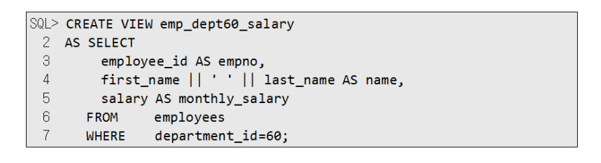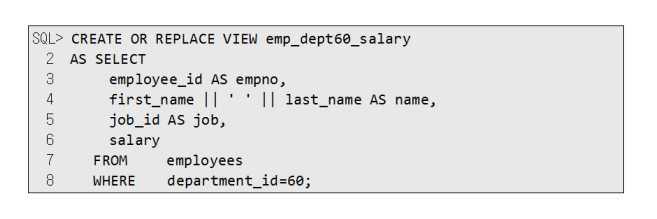 다음 구문은 부서 60에 대해 사원 번호는 EMPNO, 이름은 NAME 급여는 MONTHLY_SALARY 별칭을 갖는 뷰를 생성합니다.