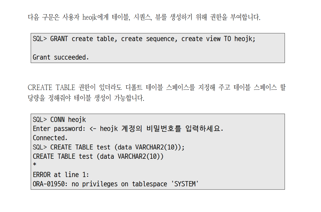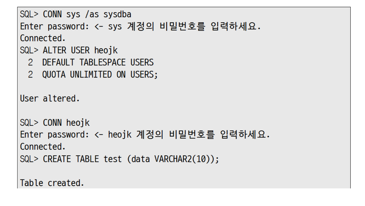 다음 구문은 DBA 사용자가 heojk 사용자에게 디폴트 테이블 스페이스를 USERS 테이블 스페이스로 지정합니다. USERS테이블 스페이스를 사용할 수 있는 용량의 최대 제한이 설정합니다.