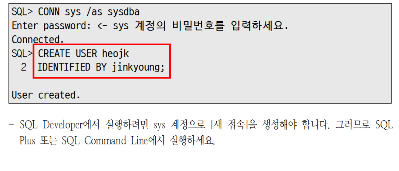 다음 구문은 사용자를 생성합니다. 사용자를 생성하기 위해서 DBA 권한을 가진 사용자로 접속해야 합니다.