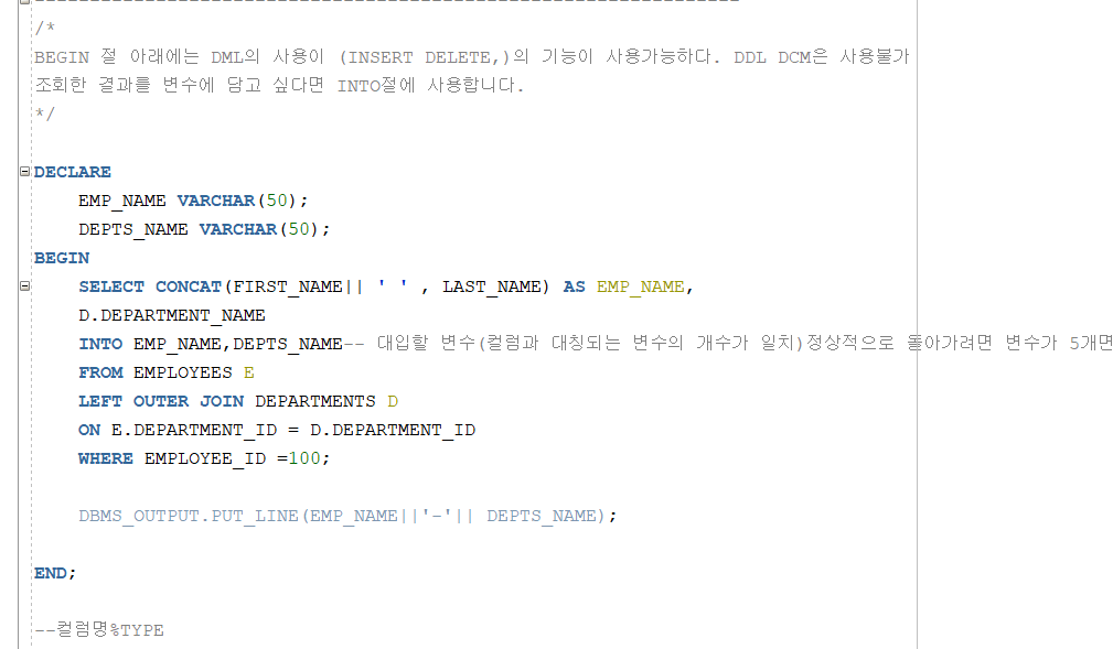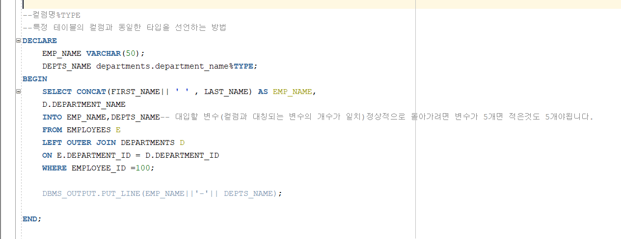 DECLARE 에 컬럼명과 %TYPE 을 붙여 선언하는 방식입니다. 같은 값을 나타냅니다.