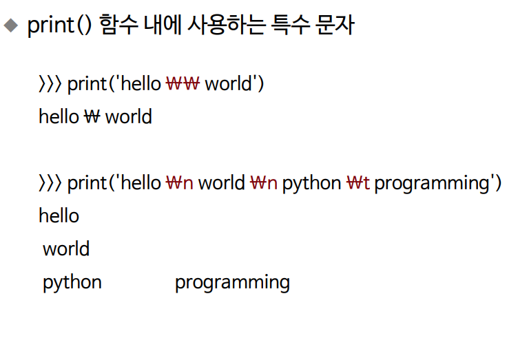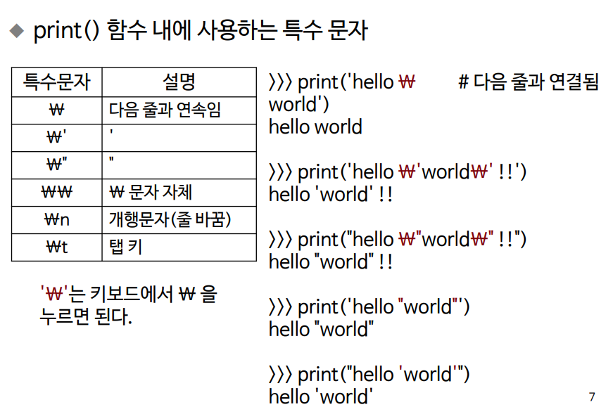 문자열을 출력하려면 홑따옴표 또는 쌍따옴표를 이용한다.