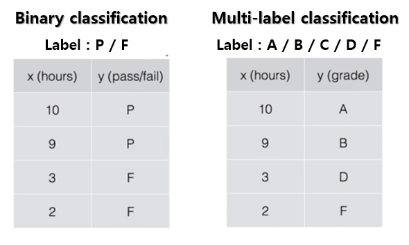 -binary classification : 두단계로 분류 (ex) 공부시간에 따른 P or F