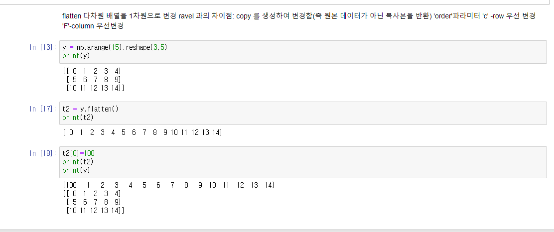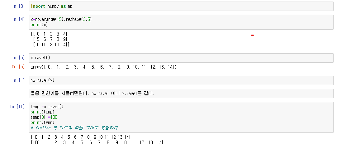 ravel 과의 차이점: copy 를 생성하여 변경함(즉 원본 데이터가 아닌 복사본을 반환)