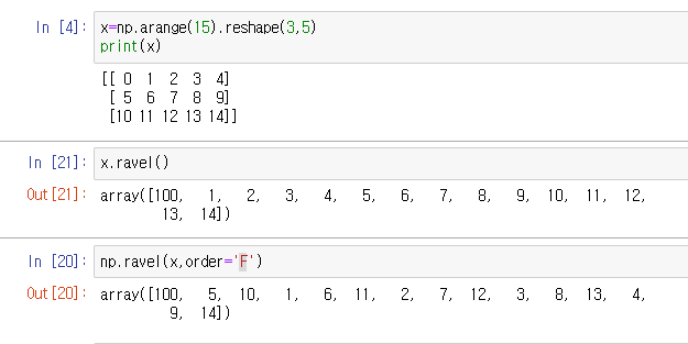 ravel,np.ravel : 다차원배열을 1차원으로 변경