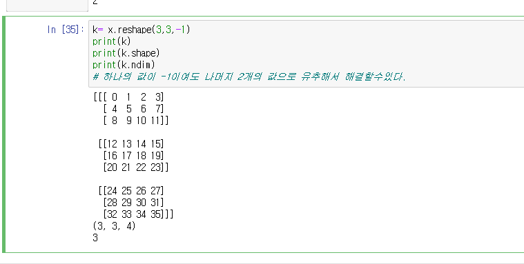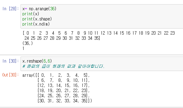 - 주의할점은 reshape 한 후의 결과의 전체 원소 개수와 이전 개수가 같아야 가능