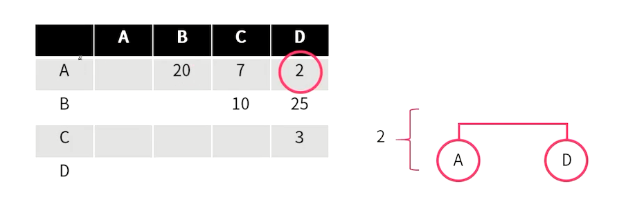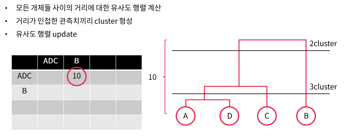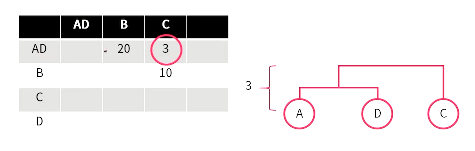 AD군집과 가장 가까운 거리는 C라는것이라고 해서 묶어서 새로운 cluester로 할당을 하는것이다.