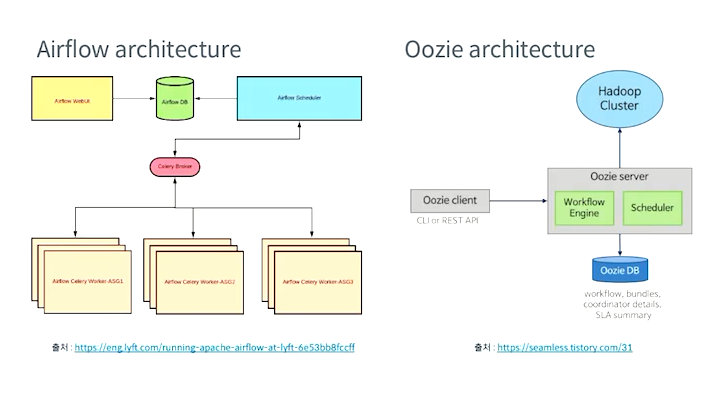 Apach Oozie 도 있는데 Oozie에서만 제공하는 기능만 사용할수 있고, airflow 와 같이 추가적으로 해결을 못하고 코드가 길어지는 단점이 있지만